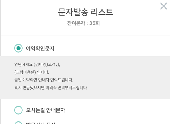 오시는길 안내 취소또는환불안내 휴일안내등 자체적으로 자주발송하는 문자를 설정해서 수동으로 발송할수 있습니다.